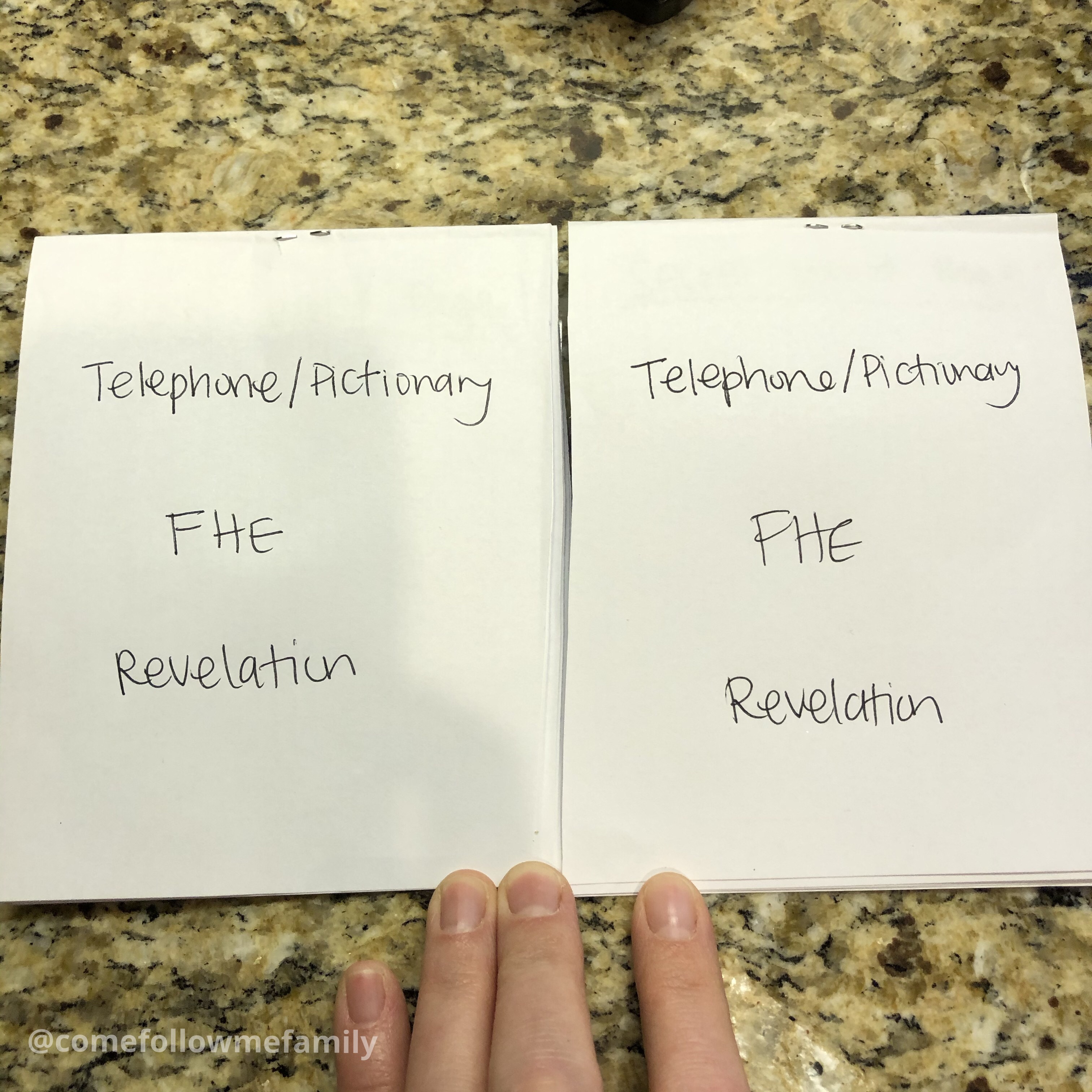Write on the first page the word or sentence. You can write beforehand on the booklets the word or sentence or you can have pieces of paper that each player chooses with a word or sentence. Pass the booklet to the player on the left. When everyone has their neighbor’s booklet, read the word or sentence and start drawing on the next page – Sketch It. Everyone has 1 minute. When the time is up, pass the booklet on to the player on the left. This time when everyone gets a booklet, they look at the drawing and make their guess on the following page. Be sure to WRITE your guess and not draw it.You don’t need a timer for this. When everyone is done, continue to pass to the person on the left. This time you are back to drawing what is written.